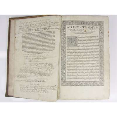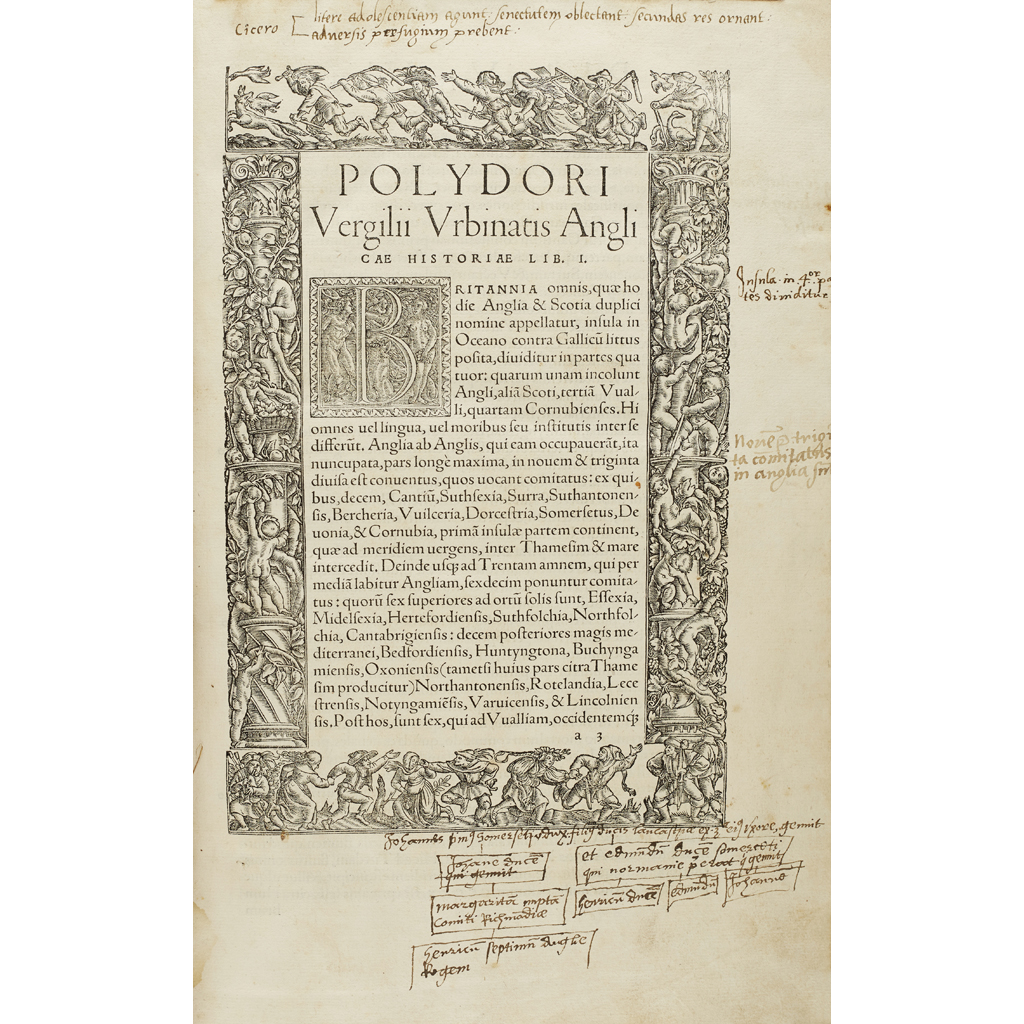 Anglicae historiae libri vigintisex. Basle: Michael Insigrin, 1546. Folio, [2], 618, [36], woodcut device on title and verso of final leaf, a2 and a3 with woodcut borders, extensively annotated in an early hand in the margins, verso of title and final leaf, inscription on title dated 1552, early medicinal prescription "To take away ache" on title verso, ?18th century calf, rebacked, corners worn, bookplates of Sam. Wegg Esq. & C.E.De M.K., [USTC 684706]
