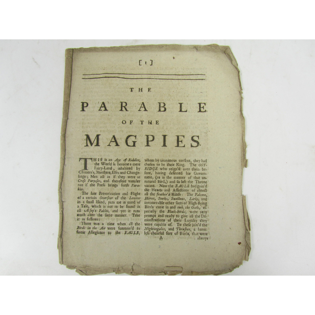 [drop head title:] The Parable of the Magpies [colophon:] Printed for B. Griffitts, 1691. 4to, pp.7, uncut, unbound, slightly frayed and dust-soiled at edges, [ESTC R5274]; (there was another issue of 4 pages and a third ESTC entry for one with an unspecified number of pages); [Bristol] - Colston, Edward. [drop-head title:] Copies of Mr. Colston's Settlements. [N.p., n.d., ?London, c. 1725,] 4to, pp.75, later cloth, woodcut initials and head-pieces to each section, browned in places, a few damp or other stains, [ESTC T211605]; [Cumberland, Henry Frederick, Duke of] Genuine Copies of all the Love Letters and Cards which passed between an Illustrious Personage and a Noble Lady. London: L. Browning, [?1770]. 8vo, disbound, [ESTC T110817, 3 copies: BL, Huntington and Texas]; [Roscoe, William] Strictures on Mr. Burke's Two Letters, addressed to A Member of the present Parliament. Part the First [all published]. London: G. G. J. and J. Robinson, 1796. First edition, 8vo, disbound, [ESTC T6725: 3 copies in UK, 2 in the USA] (4)