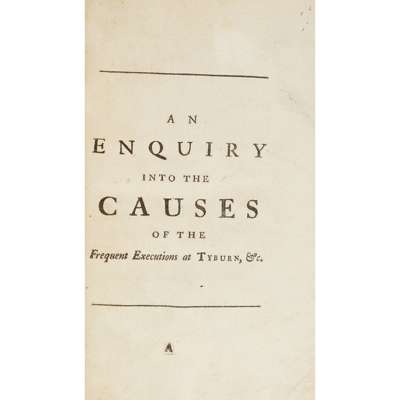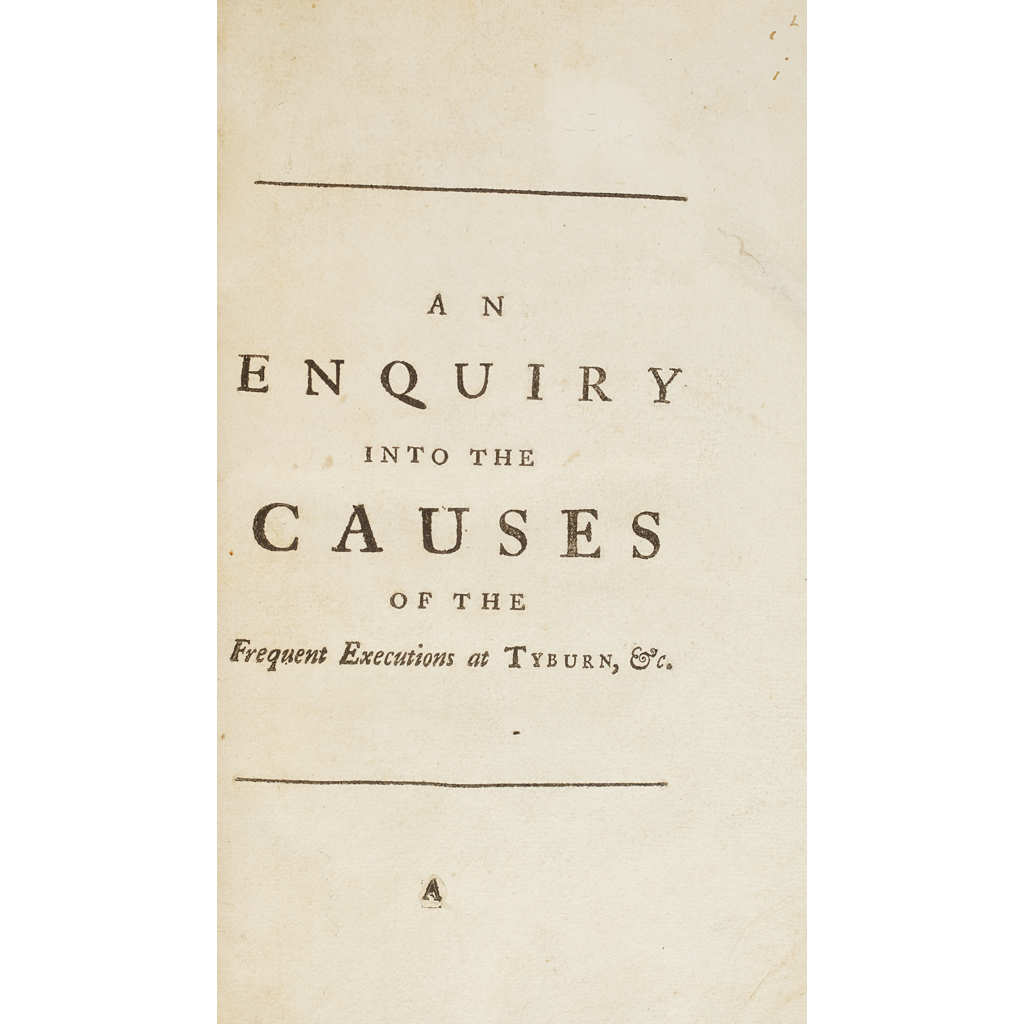 An Enquiry into the Causes of the frequent Executions at Tyburn: and a Proposal for some Regulations concerning Felons in Prison, and the good Effects to be expected from them. To which is added, a Discourse on Transportation, and a Method to render that Punishment more effectual. London, Printed: and sold by J. Roberts, 1725. First edition, 8vo, pp. [16], 55, [1], with the half-title (short tear repaired), early 20th century brown morocco, t.e.g., others uncut