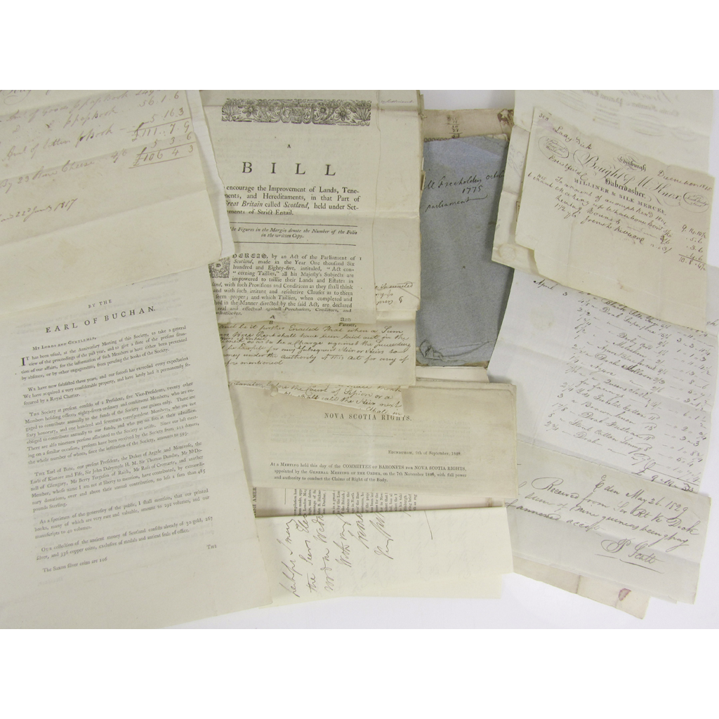 A Bill and Act for Upholding and Repairing the Bridges and Highways in the County of Edinburgh. Edinburgh, 1733. Later edition, small 8vo pamphlet; A Bill for Altering and amending the Laws which regulate the Qualifications of Freeholders... Edinburgh, 1775. Small 8vo, blue wrappers, a few manuscript annotations in an early hand; Copies of two documents stating that William Douglas of Killhead permits his son to inherit his property, dated 1724 and 1727; Copy of a letter dated 1760 to Miss Jenny Douglas: "Madame, I'm extremely sorry to find that all that has passed between you & me is now become the common talk of the Tea Tables & Coffee houses..."; a collection of receipts from Edinburgh traders; Nova Scotia Nova Scotia Rights, Edinburgh 9th September 1847, 4 printed pages; The Nova Scotia Question in connection with the Relief of Highland & other Destitution... Glasgow, 1847. 8vo pamphlet, 2 copies; and various other documents relating to the British American Association; and other documents (small quantity)