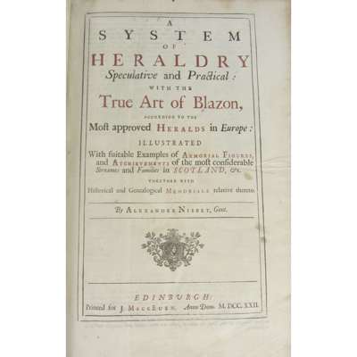 A System of Heraldry... Edinburgh: J. MackEuen, 1722. Folio, 33 plates (one torn, not affecting engraved area), contemporary panelled calf, joints splitting, some spotting and browning; Abercromby, Patrick The Martial Achievements of the Scots Nation. Edinburgh: Robert Freebairn, 1711. 2 volumes, 4to, contemporary panelled calf, bookplate of Lord Prestongrange, some wear to joints, some browning; Madox, Thomas Baronia Anglica... London: Francis Gosling, 1741. Folio, contemporary calf, rebacked, bookplates (4)