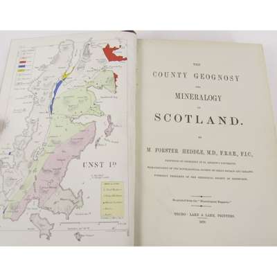 The County Geognosy and Mineralogy of Scotland. Truro: Lake & Lake, printers, 1878-1880. 2 volumes, 8vo, both volumes inscribed: "J. Arthur? Esq. M.D. from his friend M. Forster Heddle, 1886", contemporary quarter calf, J. Robertson bookplates (2)