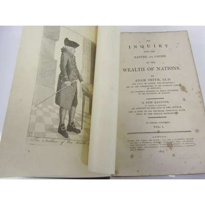 An Inquiry into the Nature and Causes of the Wealth of Nations. London: Cadell and Davies, 1812. 3 volumes, 8vo, Kay's portrait of Adam Smith inserted as frontispiece, half-titles in volumes 2 and 3 only, contemporary calf gilt with black morocco labels to spines, ownership signatures of Alfred Hardwick (1819) to paste-down endpapers, pencil notes to flyleaf in volume 1, a little foxing in places, covers slightly rubbed (3)