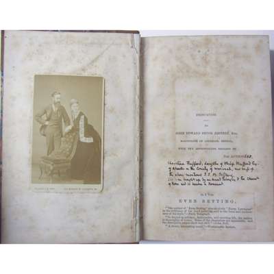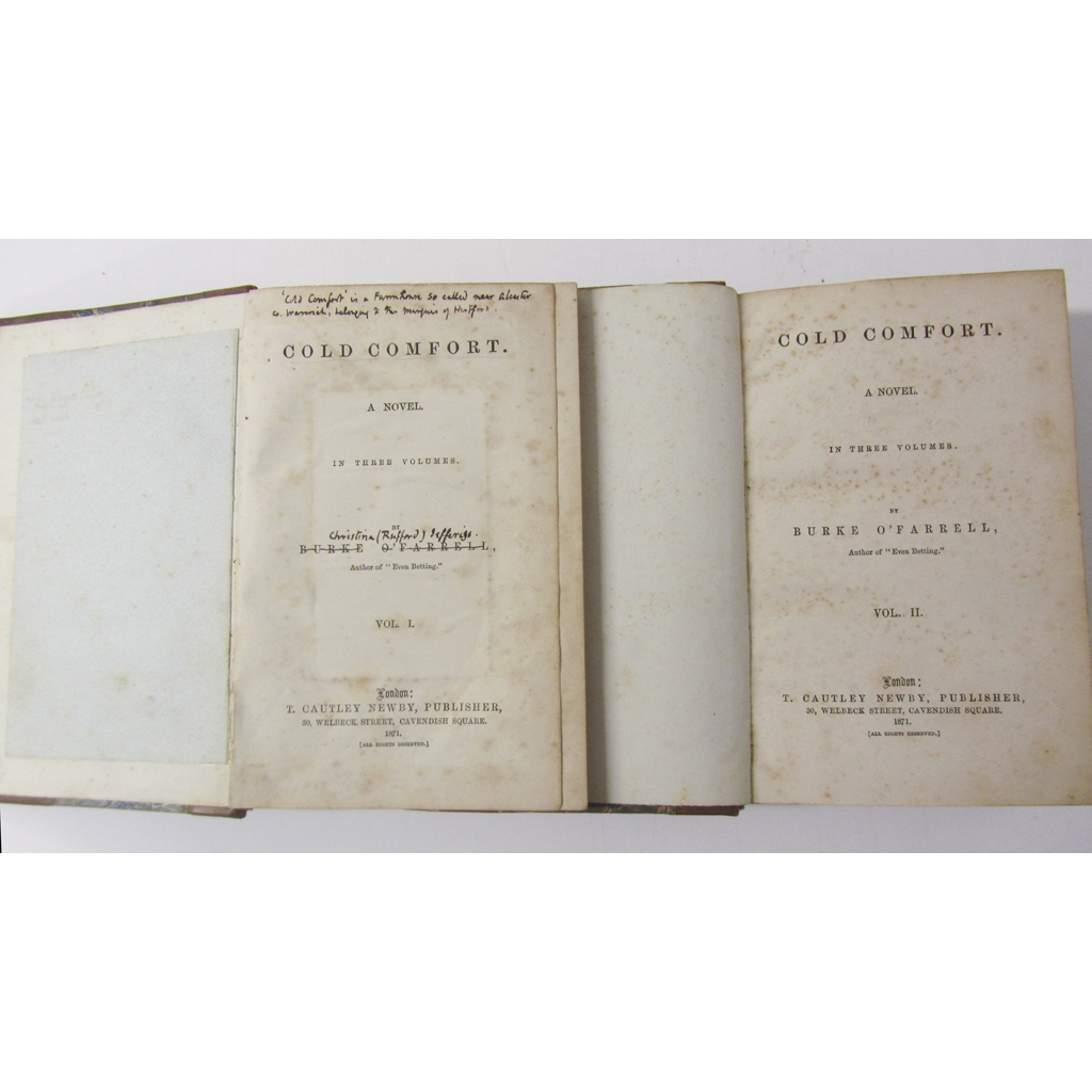 Cold Comfort. A Novel. In three volumes. London: T. Cautley Newby, 1871. 3 volumes in 2, volume 1 with "Burke O' Farrell" scored through and "Christina (Rufford) Jeffery" supplied in ink its place, 2 carte-de-visite photographs inscribed "the authoress" attached to front pastedown, and name "J.R. Bloxam, Beeding Priory", with list of names of characters in the novel set against names of real members of the Jeffery, Rufford, & Purton families, together with note at head of title "'Cold Comfort' is a Farmhouse so called near Alcester, Co. Warrick, belonging to the Marquis of Hertford", with the dedication page annotated "Christina Rufford, daughter of Philip Rufford Esq. of Alcester in the County of Warwick, and wife of the above mentioned J[ohn] E[dward] B[evor] Jeffery. She was brought up by an aunt belonging to the Church of Rome and so became a [?revenant]", a third carte de visite pasted in, some spotting