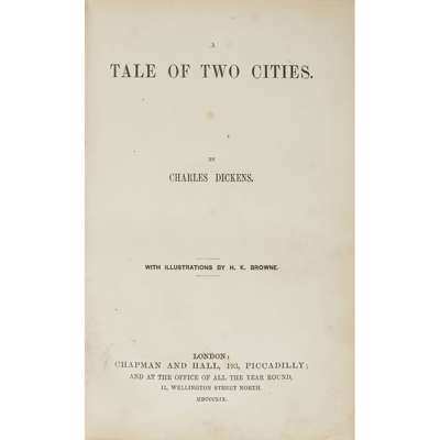 A Tale of Two Cities. London: Chapman & Hall, 1859. First edition, first printing with p. 213 numbered 113 and signature "b" on the list of plates, 8vo, plates, contemporary green half morocco, some fading and spotting, without adverts