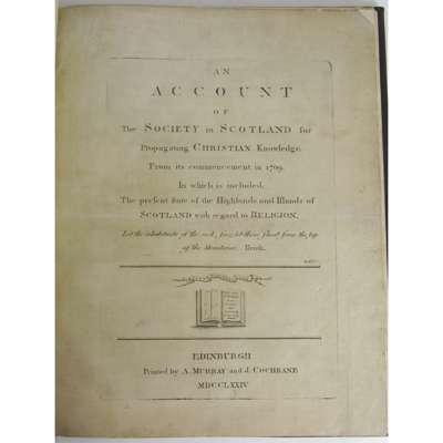 An Account of the Society in Scotland for Propagating Christian Knowledge from its commencement in 1709. In which is included The Present State of the Highlands and Islands of Scotland with regard to Religion. Edinburgh: A. Murray and J. Cochrane, 1774. Small 4to, modern brown morocco gilt, small repairs to title and final page, some slight fading [ESTC T82929]