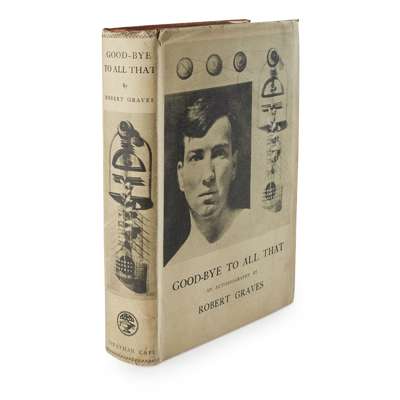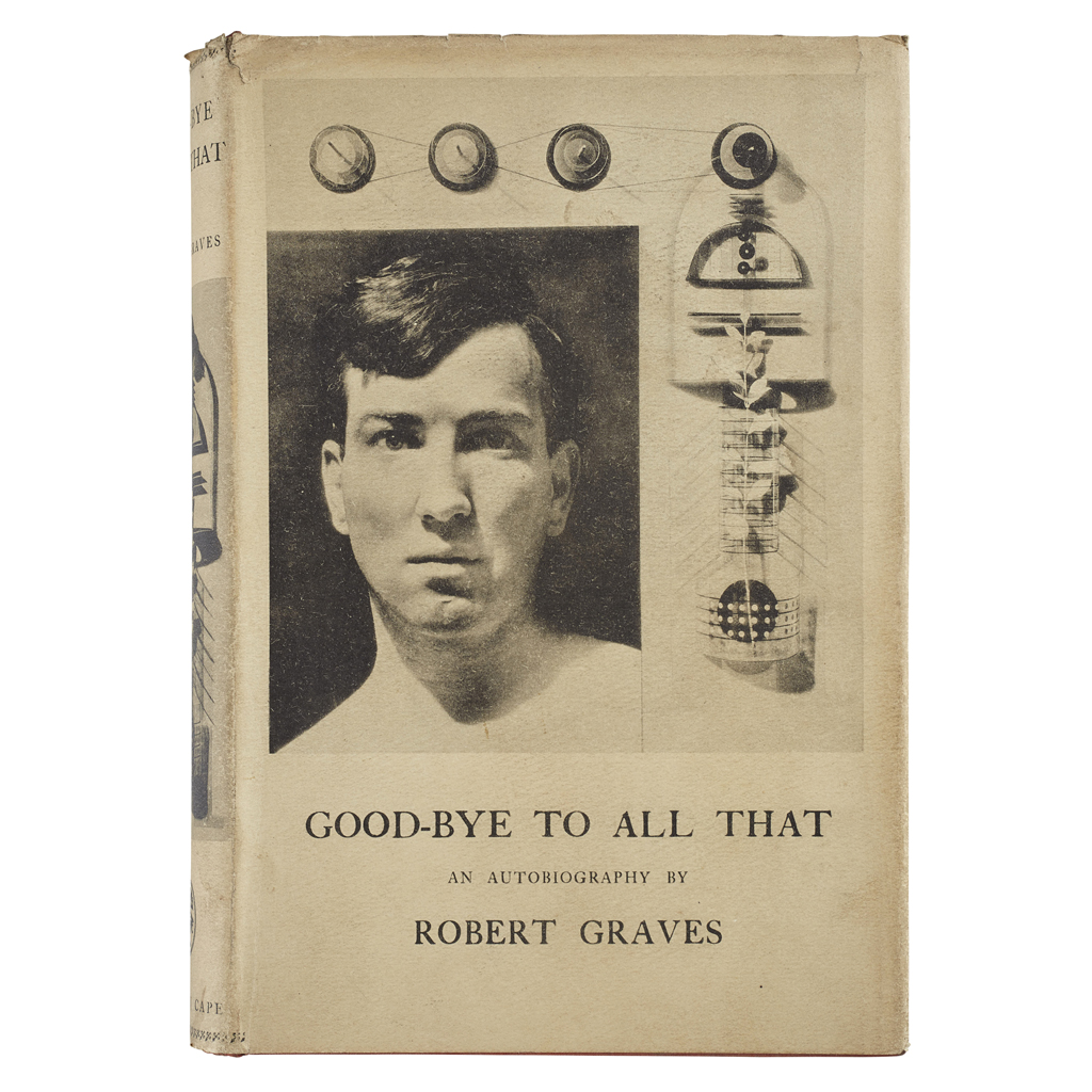 Good-bye to all that: an autobiography. London: Jonathan Cape, 1929. First edition, first state, 8vo., portrait frontispiece, plates (including double plate), publisher's salmon coloured cloth, dust wrapper, wrapper a little discoloured and with a little wear at head, very slight foxing to upper outer edge, wrapper price-clipped with repairs to underside, with the book plate of R. J. Dickinson