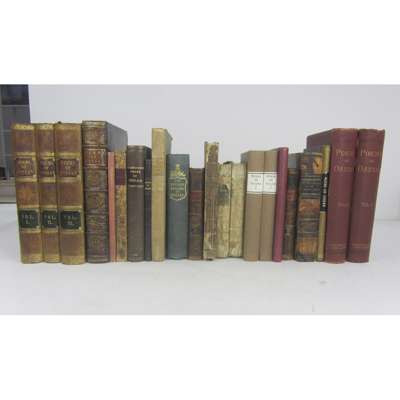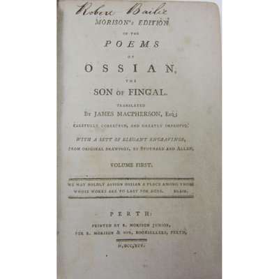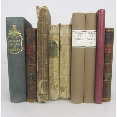 The Poems of Ossian in the Original Gaelic... London: G. and W. Nicol, 1807. 3 volumes, 8vo, large paper copy, contemporary half calf neatly rebacked; Davies, Edward The Claims of Ossian... Swansea: Longman and Co., 1825. 8vo, original boards; [MacNeill, Archibald] Notes on the Authenticity of Ossian's Poems. Edinburgh, 1868. 8vo, inscribed to half-title with the author's compliments, later quarter calf; Graham, Patrick Essay on the Authenticity of the Poems of Ossian. Edinburgh: Peter Hill..., 1807. 8vo, contemporary calf; MacPherson, James Fingal, an ancient epic poem. London: T. Beckett and P.A. De Hondt, 1762. 4to, contemporary calf, neatly rebacked with gilt tooled spine; [Idem] Dàna Oisein Mhic Fhinn... Edinburgh, 1818. 8vo, contemporary calf; Mackenzie, Henry Report of the Committee of the Highland Society of Scotland appointed to inquire into the nature and authenticity of the Poems of Ossian. Edinburgh, 1805. 8vo, modern quarter calf; Clark, John An Answer to Mr Shaw's Inquiry into the Authenticity of the Poems ascribed to Ossian. Edinburgh, 1781. 8vo, modern half calf, dust-soiled, stamp of the Free Church College Edinburgh; and 12 others, sold not subject to return (22)