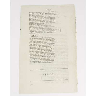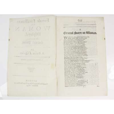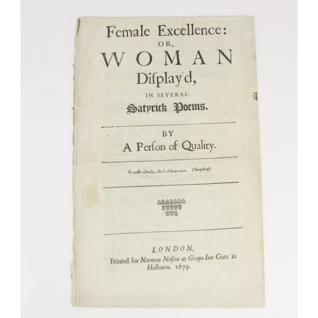 or, Woman display'd, in several satyrick Poems. By a Person of Quality … London, Printed for Norman Nelson … 1679. First edition, folio, pp. 8, disbound, a small wormtrack touching three letters, [Wing R1749; ESTC R1389]