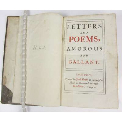 Letters and Poems, amorous and gallant. London, Printed for Jacob Tonson, 1692. First edition, 8vo, pp. [16], 120, title-page printed in red and black, contemporary mottled calf, rebacked, early armorial bookplate of the Bellasyse library (Viscount Fauconberg), [Wing W 647; Hayward 136]