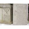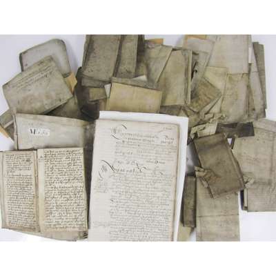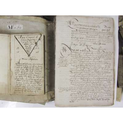 largely in English (or Scots) with some sections in Latin, containing exemplars of gift of tutorie, oblivgatioun be way of contract, charters of recognition, gifts of escheit, back-bonds, dispositions, instruments of consignation, contracts, chartour of alinatioun of lands with precept of seasing, charters of excambioun, obligatioun by way of contract, &c., c. 200 pages, 4to, contemporary vellum detached, some dampstaining at end (not affecting legibility, early 17th century; Small legal manuscript "Ane Compend off some practiques before the Lords since his Ma[jes]ties cuming home to Scottland qch was in ano 1606". 1686, 8vo, 70pp., several leaves detached, contemporary calf, author's name "Ja. Huttone" at end, binding detached; and a quantity of 17th century sasines, some relating to Alex[ander] Gall de Mall, one to William Hog Boigend of Aiton parish, one charter of Gilbert Gourlay in favour of Robert Bennet of lands in Kirktouns, one from 1486: transcript of ane decreit arbitall betwix Parick Douglassone to Johne Douglas of Barncay and Alex. David & Archibauld Dunbaris anent.. of the lands of ?? (this one in poor condition), all folded, some a little dusty