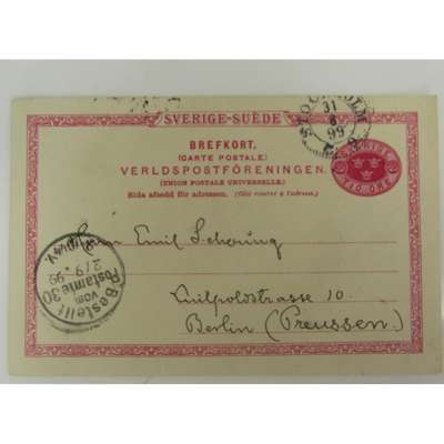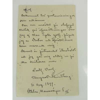 ALS signed August Strindberg to Emil Schering, dated 31. August 1899, Stockholm, Narvavägen 5, III, 14 x 9cm postcard addressed to upper side with letter to reverse, Strindberg apologises to Schering for criticizing his translation, explaining that he does not speak German himself and instead consulted a language tutor who made him look foolish