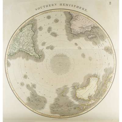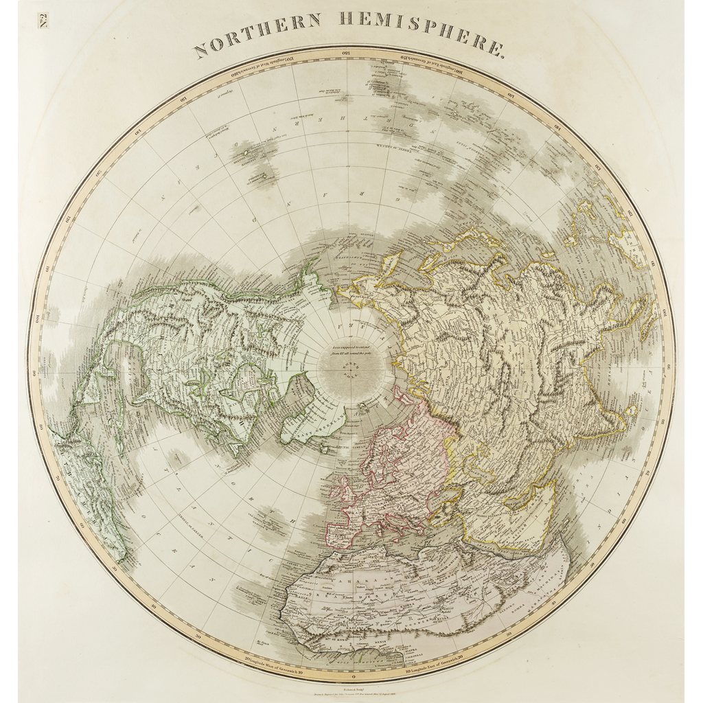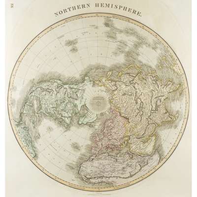 A New General Atlas. Edinburgh: J. Thomson, 1829. Large folio, folding frontispiece (Mountains), folding plate (Lengths of the Principal Rivers) and maps numbered 1-76 mounted on guards throughout (including 10 pt. 1 & 2 joined, 11 pt. 1 & 2 joined, 12 pt. 1 & 2 joined, 25 pt. 1 & 2 joined, 27 pt. 1 & 2 joined, 27 pt. 3 & 4 joined, 34 parts 1-4 joined as 2, 42 in 2 sheets; 43 "2nd" (Birman empire), occasional slight discolouration, one map (Asia) split at fold without loss, contemporary half calf, spine gilt, joints splitting, rubbed