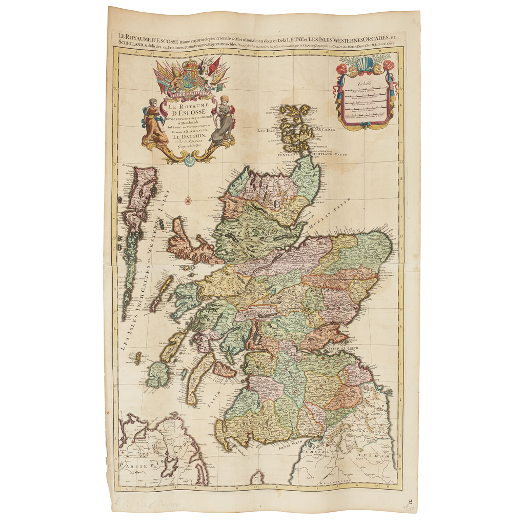 Le Royaume d'Escosse... dressé sur les memoirs les plus nouveaux par le S. Sanson. Paris: H. Jaillot, 1693. Engraved map of Scotland, hand-coloured, 975 x 63mm., 2 sheets joined as one, slight discolouration to upper part
