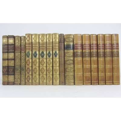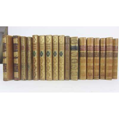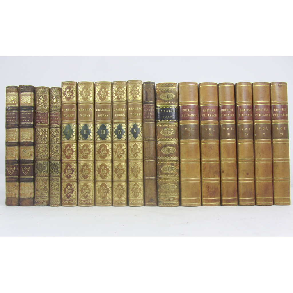 The Works... in five volumes. London: John Murray, 1823. 5 volumes, 8vo, contemporary calf, spines gilt, this copy bound without the plates found in a few sets; Alison, Archibald Essays on the Nature and Principles of Taste. Edinburgh, 1811. 2 volumes, 8vo, contemporary calf, spines gilt, morocco lettering pieces; [Senault, J. - F.] The Philosophy of the Passions. London: J. Almon, 1772. First English edition, 2 volumes, 8vo, contemporary calf, spines gilt; Wrangham, F. The British Plutarch, containing the Lives of the most eminent Divines, Patriots, Statesmen, Warriors, Philosophers, Poets and Artists. London: J. Mawman, 1816. 6 volumes, 8vo, contemporary half calf, spines gilt; Milton, John Paradise Lost. London, for J. Johnson [&c.], 1802. 8vo, additional engraved title, portrait, & 12 plates after Burney, contemporary mottled calf gilt, black morocco label, slightly worn at head of spine; Cicero Of the Nature of the Gods. London, 1775. 8vo, edited by Dr. Francklin, half-title, contemporary calf gilt (17)