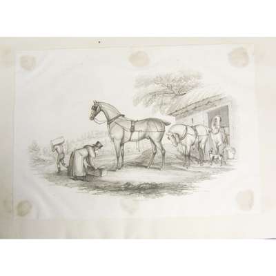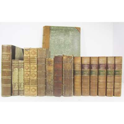 [Fourteen Engravings, from Drawings of the Horse. Edinburgh, 1824.] 10 (of 14) engravings mounted in a large folio half calf album, 2 slightly cut down; Kirby, W.F. The Butterflies and Moths of Europe. 1904. 4to, 54 coloured plates, contemporary brown half morocco gilt, t.e.g., upper hinge broken; Beattie, William Switzerland Illustrated. London: G. Virtue, 1836. 2 volumes, 4to, folding map & 106 plates, contemporary brown morocco gilt, a.e.g., worn, joints split; Sallust. The Works. London: T. Woodward & J. Peele, 1744. 4to, contemporary calf, short tear to head of spine; Rosini, Joannes Antiquitatum Romanarum corpus absolutissimum. Leiden: Hackios, Parentem & Filios, 1663. 4to, additional engraved title, folding view, engraved plates, contemporary calf, spine split, worn, covers detached; Boccaccio, Giovanni Il Decameron. "1527" [Venice: Pasinello, 1729], small 4to, 18th century calf, some light dampstaining, worn, one cover detached; Xenophontis De Cyri Expeditione libri Septem. Cambridge: J. Archdeacon, 1785. 4to, folding map, text in Greek and Latin, contemporary calf, worn, upper cover detached; Cuming, R.G. Five Years of a Hunter's Life in the Far Interior of South Africa. 1850. First edition, 2 volumes, 8vo, additional titles, map and 14 plates, original pictorial cloth gilt, spines worn; The Old Testament; The New Testament, edited by Rev. Charles Girlestone. 1837, 4 volumes; 1835, 2 volumes, uniform contemporary half calf; Finden, W. & E. Landscape Illustrations of the Bible. 1836. 2 volumes, large 8vo, engraved titles & plates, contemporary calf, slightly rubbed; [Keith, Robert] The History of the Affairs of Church and State in Scotland, Edinburgh, 1734. Folio, volume 1 (all published), engraved map, contemporary calf, head and base of spine worn; and 14 others, miscellaneous; sold not subject to return (quantity)