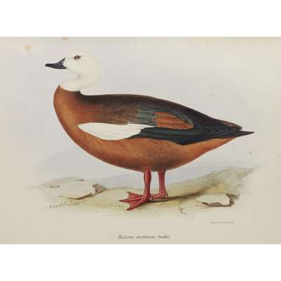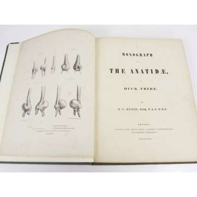 A Monograph of the Anatidae or Duck Tribe. London: Longman, Orme, Brown, Green, & Longman, 1838. 4to, 6 hand-colored plates by Edward Lear and 18 plain plates by G. Scharf, original green cloth rebacked with a modern green cloth gilt spine, some spotting and foxing, repair to the title-page and to p.173