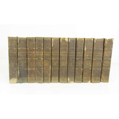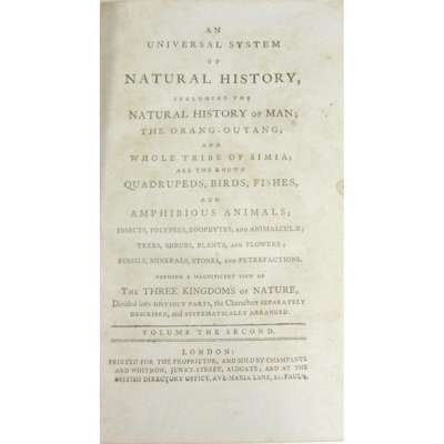 A Genuine and Universal System of Natural-History... London: printed for the proprietor and sold by Champante and Whitrow..., [1794-1810?] volumes 2-14 (ie. 13 volumes only of 14), volumes 2-7 with the title A Universal System of Natural-History and without Linnaeus's name, 386 hand-coloured plates (the full 14 volumes should contain 424 plates), contemporary straight-grained morocco, some darkening and spotting to various plates and pages, a few plates a little trimmed affecting captions, some dampstaining to volume 3, covers rubbed and some are becoming detached, spines chipped (13)