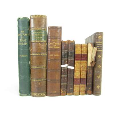 The British Flora. Manchester: R. Bickerstaff [&c..], 1799. 2 volumes, 8vo, contemporary calf, title to volume 1 and boards detached; and 8 others Flipippi, Filippo de. Ruwenzori. London: A. Constable, 1909. Second impression, colour frontispiece, 5 folding panoramas & 5 folding maps (3 coloured), plates, original red cloth gilt, t.e.g., upper cover corner flecked, hinges slightly weak (10)