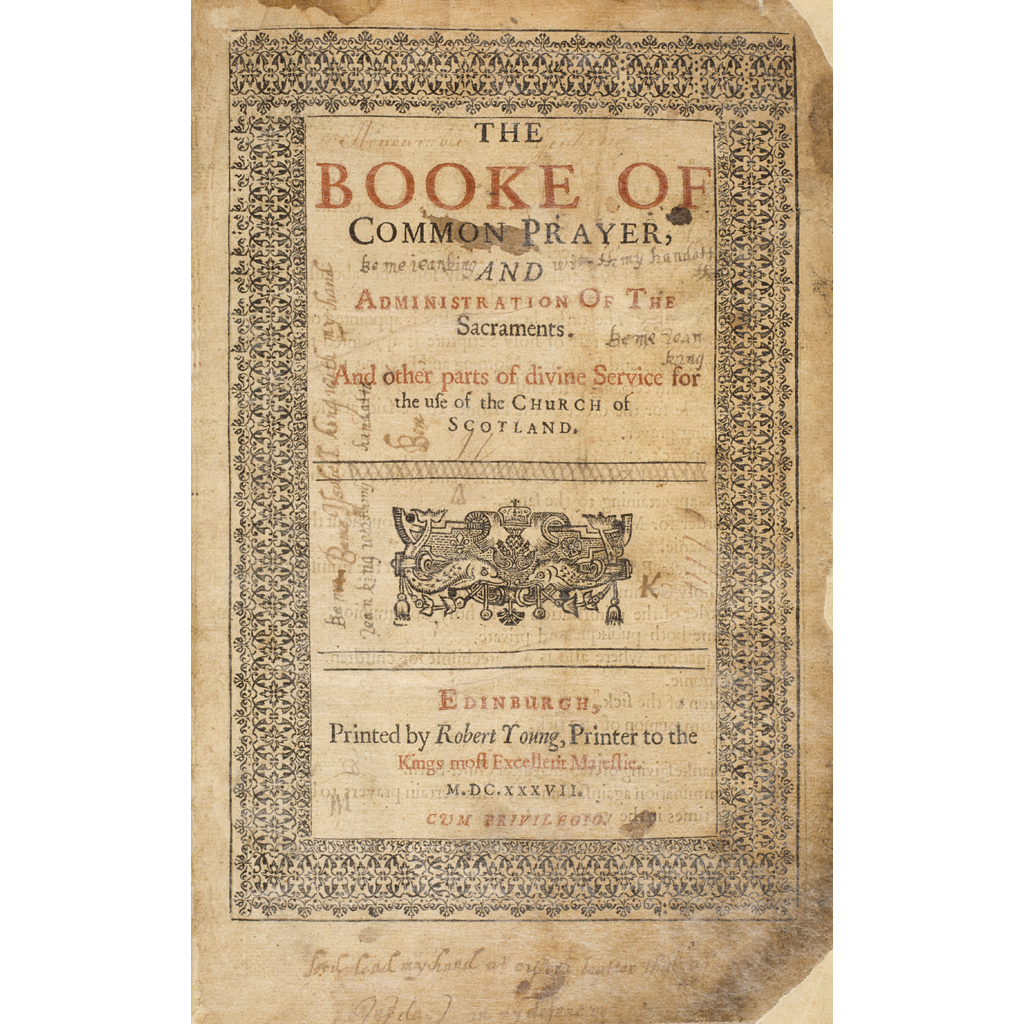 The Booke of Common Prayer... for the Use of the Church of Scotland. Edinburgh: Robert Young, 1637, [2nd part: The Psalter. Edinburgh: Robert Young, 1636]. Folio, 2 parts in one volume, title printed in red and black within typographic border, black letter, woodcut initials, The Psalter ending on KK6 [KK6 without the catchword "Certaine"], 2 leaves (? from another edition) "Certaine godly prayers" loosely inserted, first 7 leaves repaired with corners renewed, some soiling and spotting, P1 torn without loss, P2 and P7 with slight marginal loss; (bound with The Psalmes of King David, translated by King James. London: Printed by Thomas Harper, 1636, [2], 147); modern period-style calf, brown morocco label, bookplate of Sir Archibald Dunbar of Northfield, Bart., loosely inserted, with early signatures of Isobell King, William King, Agnes King, Jean King, James King, Goreff King, Barbara Cumming and others, a few headlines slightly trimmed
