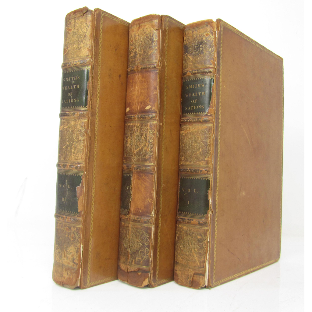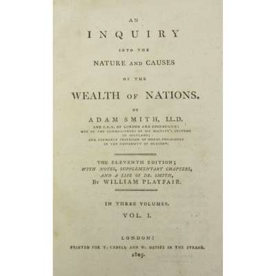 An Inquiry into the Nature and Causes of the Wealth of Nations. The Eleventh edition, with Notes, Supplementary Chapters, and a Life of Dr. Smith by William Playfair. London: T. Cadell & W. Davies, 1805. 3 volumes, 8vo, contemporary calf, spines somewhat worn