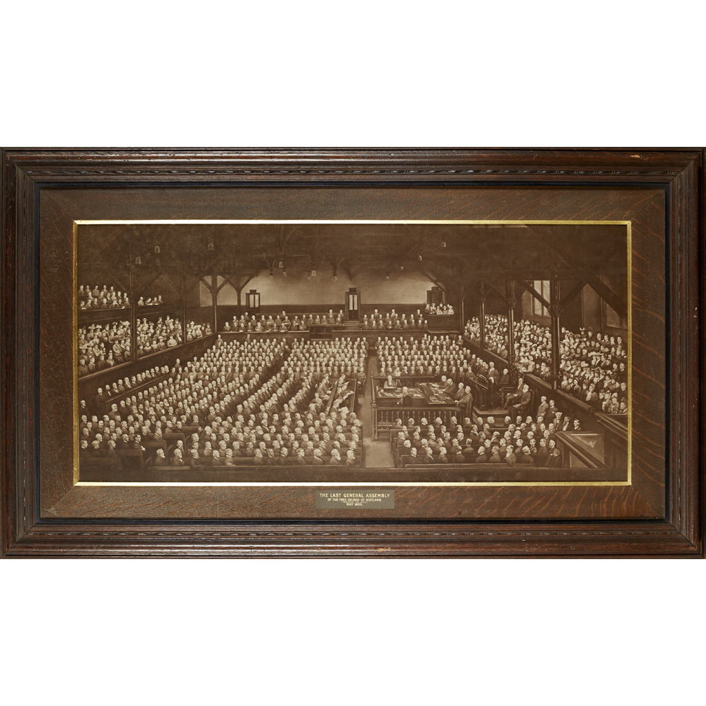 photogravure, 42 x 89cm, commemorating the last General Assembly of the Free Church of Scotland in 1900, signed J. Pursey, Edinburgh, No.55a to the print, framed and glazed, along with a scroll produced by Pursey, listing each sitter by name
