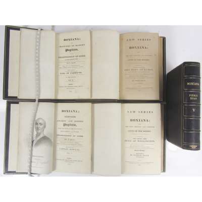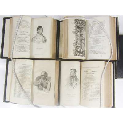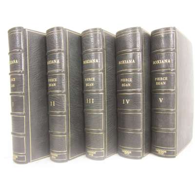 Boxiana; or, sketches of ancient and modern Pugilism, from the days of the renowned Broughton and Slack, championship of Cribb. London: Sherwood, Jones & Co., 1823-24 [Vols. 3-5: George Virtue, 1828-29]. 5 volumes, 8vo, 4 engraved title-pages (in vols. 1-4), and 73 etched plates (of which at least 15 not called for in vols. 2-5; 4 folding, 25 in volume 1 cut round and mounted), modern black period-style morocco gilt, spines gilt, raised bands, book label of E.L. Hersey; sold not subject to return