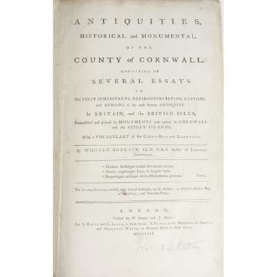 Antiquities, Historical and Monumental, of the County of Cornwall. London: S. Baker and G. Leigh... 1769. Second edition, folio, 27 plates and maps, later calf, bookplate of William Rashleigh, ownership signature dated 1952 in blue ink to p.iii [ESTC T139784]