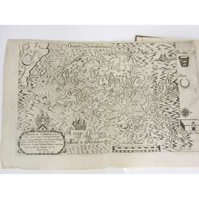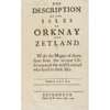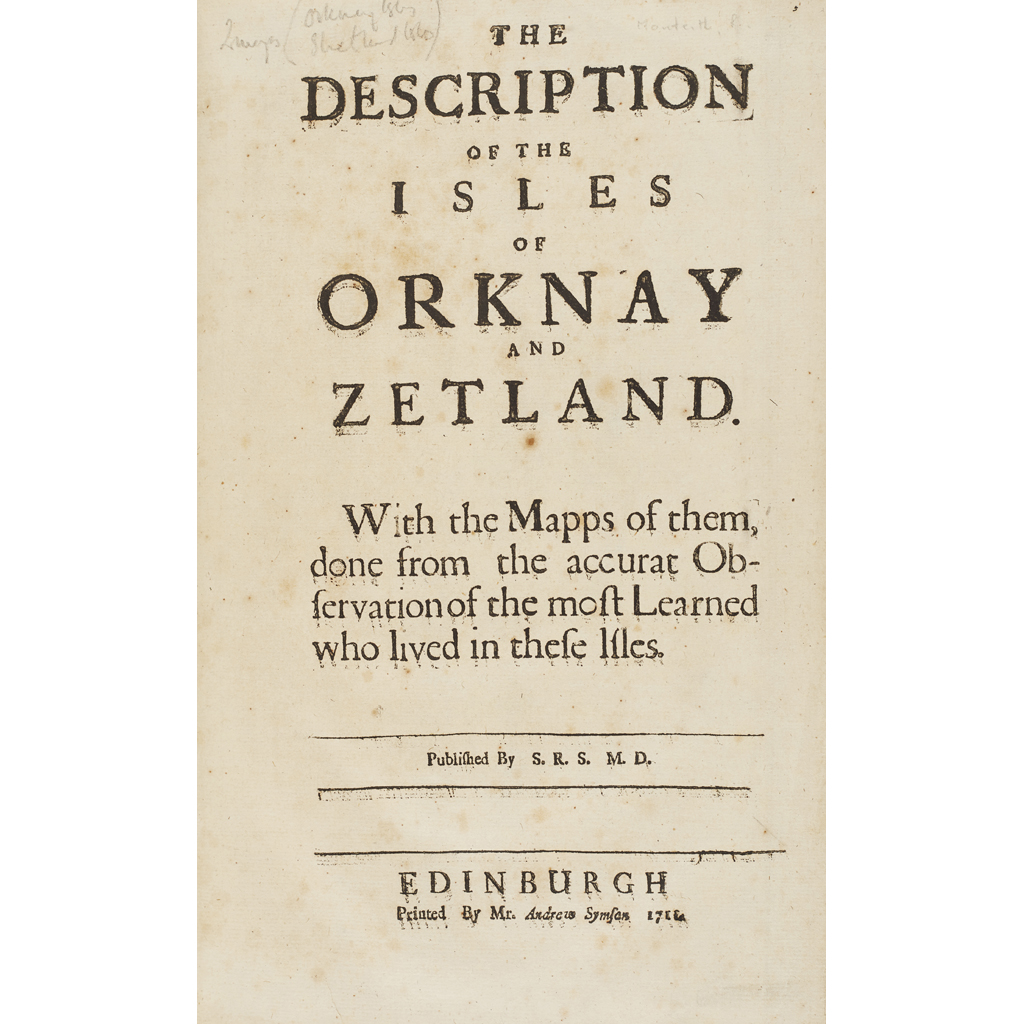 The Description of the Isles of Orknay and Zetland. Edinburgh: published by S.R.S. [Sir Robert Sibbald], 1711. Folio, folding map, single page map, 20th century half calf, folding map repaired to verso, some light foxing, stain to pp.37-38 obscuring a few words, J. Robertson bookplates [ESTC T131326]