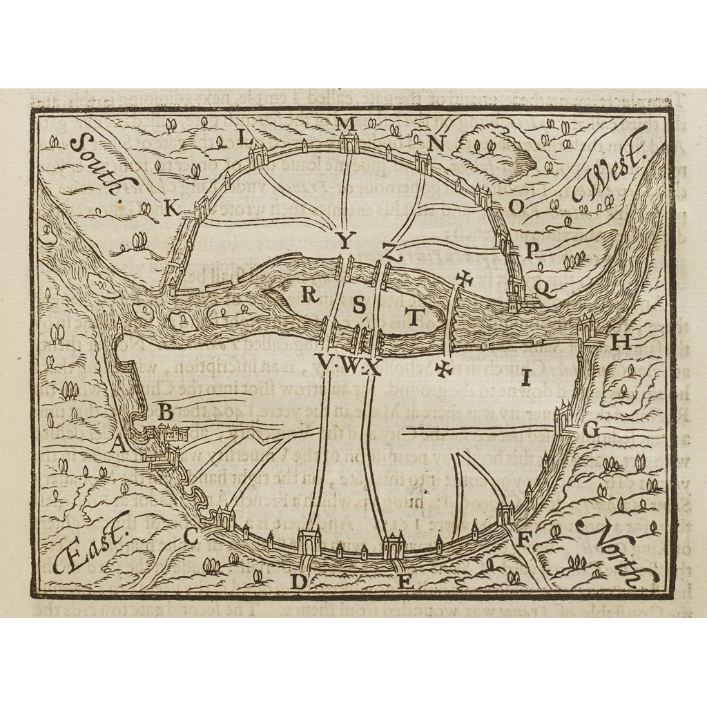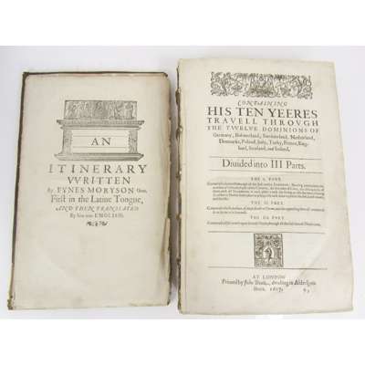 An Itinerary Written by Fynes Moryson Gent. First in the Latine tongue, and then translated by him into English: Containing his Ten Yeeres Travell through the Twelve Domjnions of Germany, Bohmerland, Switzerland, Netherland, Denmarke, Poland, Italy, Turky, France, England, Scotland, and Ireland. London: John Beale, 1617. Folio, contemporary embossed calf, lacking initial leaf (blank save the signature mark), lacking final leaf (also blank), a few small holes, slightly affecting text, and a few tears, a few words occasionally scribbled out, a little soiling and occasional light dampstaining, upper cover and first leaf detached, some rubbing and chipping to spine and covers