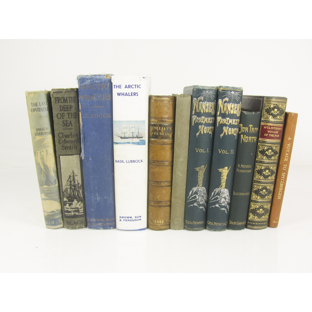 A Journal of a Voyage of Discovery to the Arctic Regions. London: Longman, Hurst, Rees, Orme, and Brown, 1821. Third edition, 8vo, map; Laing, John A Voyage to Spitzbergen... Edinburgh, 1822. Fourth edition, 12mo, modern calf; Scoresby, William Journal of a Voyage to the Northern Whale-Fishery… Edinburgh: Archibald Constable and Co., 1823. 8vo, folding maps (repaired) and plates, contemporary half calf, bookplates, foxed; McClintock, Captain The Voyage of the 'Fox' in the Arctic Seas. London: John Murray, 1859. 8vo, modern blue morocco gilt; Fergusson, R. Menzies Our Trip North. London: Digby, Long & Co., 1892. 8vo, original cloth; Nansen, Fridtjof "Farthest North"... London: George Newnes, Ltd., 1898. 2 volumes, 8vo, original cloth; and 4 others, sold not subject to return (11)