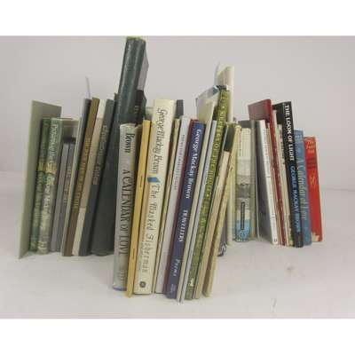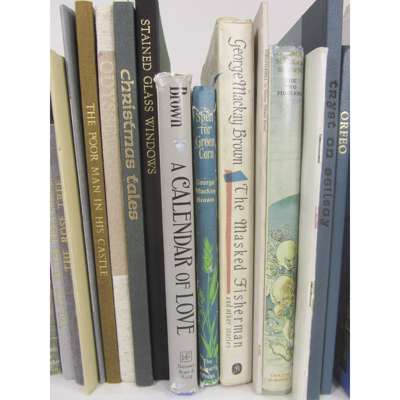 A Voyage of Saint Brandon. [N.p., n.d.] Uncorrected radio script, inscribed to Brian Murray from George Mackay Brown, dated Stromness 7/8/90; [Idem] Loaves and Fishes. London: Hogarth Press, 1959. First edition, 8vo, signed; [Idem] Poems, New and Selected. London: the Hogarth Press, 1971. First edition, 8vo, inscribed to John Broom, signed; [Idem] Greenvoe. New York: Harcourt Brace Jovanovich, [1972]. First American edition, 8vo, signed to title-page, inscribed to Brian and Eliza; [Idem] The Hooded Fisherman. Kulgin D. Duval & Colin H. Hamilton, 1985. 8vo, signed to title-page, inscribed to Brian and Eliza on the final leaf; [Idem] Christmas Stories. Oxford: The Perpetua Press, 1985. 4to, signed to final leaf, inscribed to Brian and Eliza; [Idem] In the Margins of a Shakespeare. Llandogo: The Old Stile Press, 1991. Oblong 4to, proof copy? with various annotated remarks and suggestions; [Idem] - Bryce Wilson - Keith Allardyce Sea Haven. Kirkwall: the Orkney Press, 1991. 4to, signed by George Mackay Brown and inscribed to Brian Murray within a manuscript poem to the title-page; [Idem] Brodgar Poems... Oxford: The Perpetua Press, 1992. 4to, signed and inscribed to Brian Murray; and a collection of others (55)