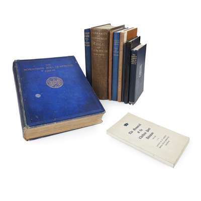 The Morayshire Roll of Honour. Elgin, 1921. 4to, original blue cloth gilt, slightly rubbed, binding slightly marked; High School of Glasgow The Book of Service and Remembrance, 1939-1945. 1948m 4to; Arbroath Roll of Honour. Arbroath and District 1939-45. Small 4to; [Glasgow] The Glasgow Academy Roll of Service 1939-1945. 1951, 8vo; Bo'ness and Carriden Parishes Roll of Honour 1939-1945. 8vo, half morocco; University of Honour Roll of Honour 1914-1919. 1921, 4to; University of St. Andrews The Roll of Honour 1939-45; Commercial Bank of Scotland Limited Roll of Honour 1914-1918. 8vo; [George Watson] A Memorial Record of Watsonians who served in the Great War 1914-1918. 1920, 4to; [George Watson] The Watsonian War Record 1939-45. 1951, 4to, dustwrapper; Royal High School Roll of Honour 1939-45; Glasgow Academy Roll of Honour 1914-1918, 1933; Ashdown, C.H. The Old Albanian. 1899-1902; George Heriot's School Roll of Honour 1939-45. 1950; Soldiers died in the Great War. The Highland Light Infantry. 1988; The Gordon Highlanders, (reprint), wrappers; and 1 other: War Graves