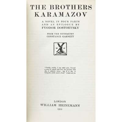The Brothers Karamazov. London: William Heinemann, 1912. First English edition, 8vo, half-title (stating this is volume 1 of Dostoyevsky's works) with adverts to verso, original red cloth with decoratively tooled spine, joints weak, some wear and fading to covers
