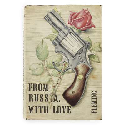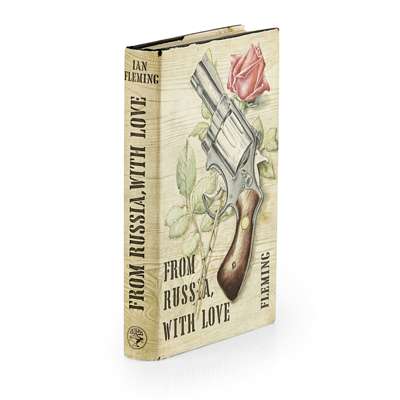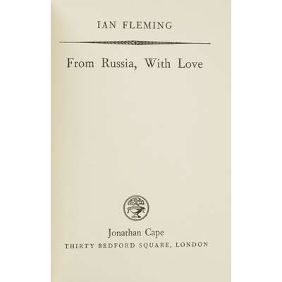 From Russia, with Love. London: Jonathan Cape, 1957. First edition, first impression with 'first published 1957' to copyright page and rear flap of dust-jacket blank, 8vo, original black cloth with gun and rose motif, dust-jacket not price-clipped but with a little chipping, slight darkening, a couple of foxing stains and some slightly indented marks to lower cover, very small closed tear to p.197, a few light internal marks, slight foxing to fore-edges and small damp spot to upper edge not affecting pages