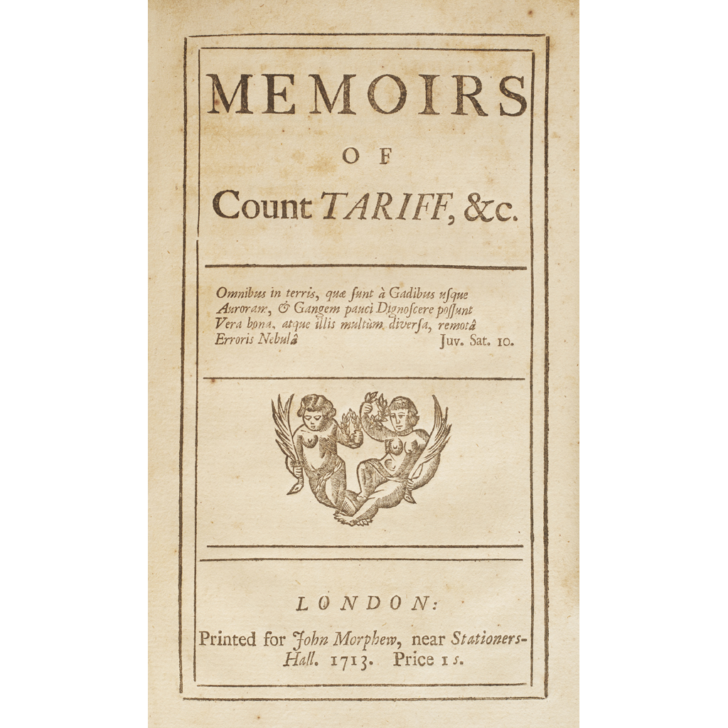 Defoe, Daniel, probable author. Memoirs of Count Tariff, &c. London: Printed for John Morphew, 1713. [Bound after:] The Honour and Prerogative of the Queen's Majesty vindicated and defended against the unexampled Insolence of the Author of the Guardian: in a Letter from a country Whig to Mr. Steele. London: for John Morphew, 1713. [bound with:] Passive Obedience establish'd; and Resistance confuted: by proving that the late, but too soon reviv'd Position, of affirming the supreme Power to be originally in the People, and in Kings but in Trust, and therefore accountable to the People... By a Gentleman of the City of Norwich. London: Printed, and are to be sold by J. Morphew, H. Clemens and F. Oliver in Norwich. 1713. [bound with:] Berkeley, John Memoirs of Sir John Berkley, containing an Account of his Negotiation with Lieutenant General Cromwel … for restoring King Charles the First to the Exercise of the Government of England. London: Printed by J. Darby for A. Baldwin, 1699. [bound with:] Mun, Thomas England's Treasure by foreign Trade; or, the Balance of our foreign trade is the Rule of our Treasure … London, Printed: and sold by J. Morphew, 1713. [bound with:] The Art of Lying and Rebelling, taught by the Whigs, in an infamous Libel, entitled the Judgment of whole Kingdoms and Nations, &c. Or, a Detection of many notorious Falsehoods and palpable Forgeries contain'd in that vile Pamphlet. London, Printed: and sold by J. Morphew, 1713; 6 works in one volume, First editions apart from Mun, contemporary limp vellum, spine lettered by hand, library stamp of D.F. Pozzolini, paper generally somewhat browned, a little occasional soiling