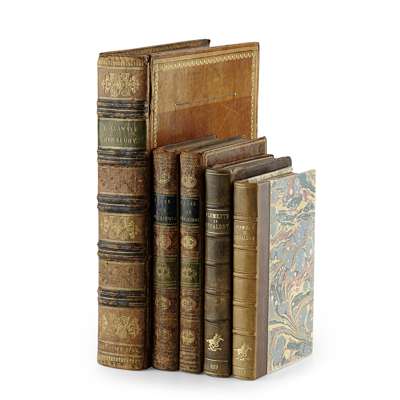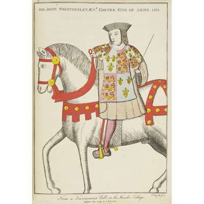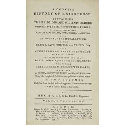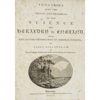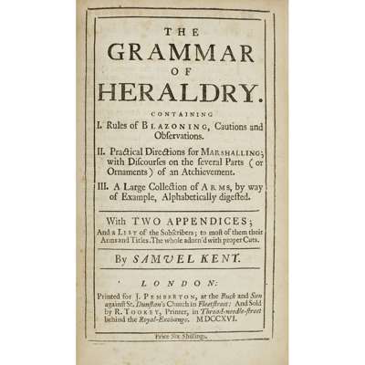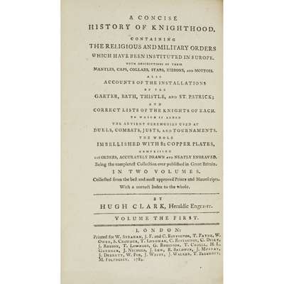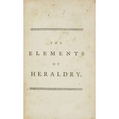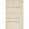 Inquiries into the Origin and Progress of the Science of Heraldry in England. Gloucester: B & J. White, 1793. 4to., engraved title, 26 plates (as listed; inc. plate 16 on p. 239 which is an illus. in the text), several coloured, contemporary panelled calf gilt, bookplate of W. Shuldham Esq., upper joint splitting; Clark, Hugh A Concise History of Knighthood. London, 1784. 2 volumes, 8vo, 61 engraved plates, contemporary speckled calf gilt, slightly rubbed; Kent, Samuel The Grammar of Heraldry. London, 1716. 8vo, hand-coloured woodcut coats-of-arms, modern quarter calf gilt; Porny, Mark A. The Elements of Heraldry. London, 1755. 8vo, frontispiece & 23 plates, contemporary calf, neatly rebacked; sold not subject to return (5)