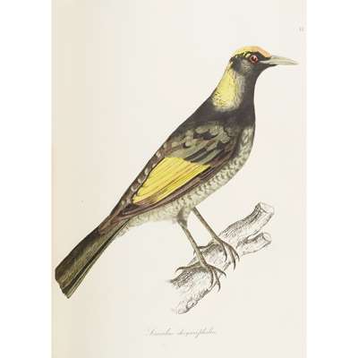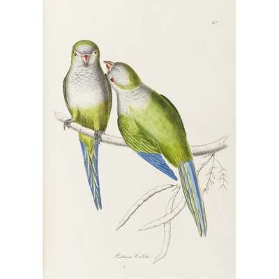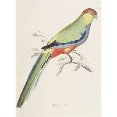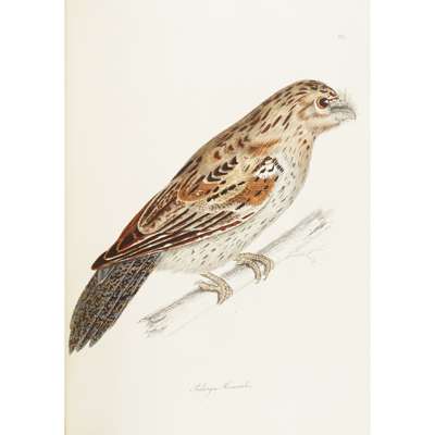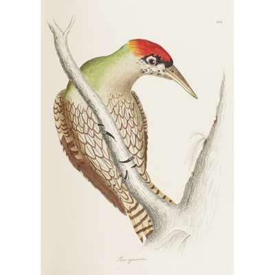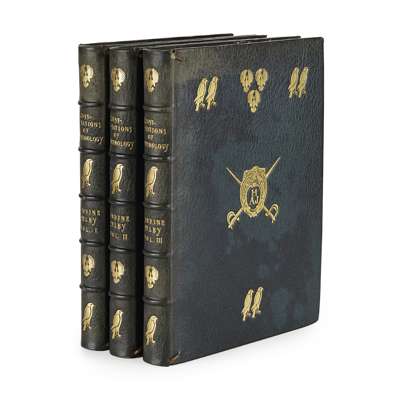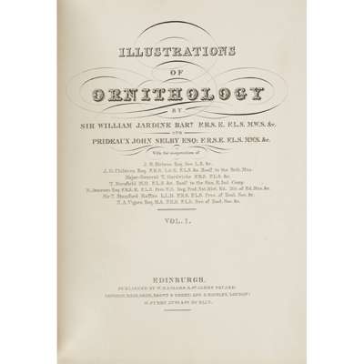 Illustrations of Ornithology. Edinburgh: W.H. Lizars, London: Longman, Rees, &c., [1826-35]. First edition, volumes 1-3, 4to (296 x 218mm.), engraved titles, 149 engraved plates, IN TWO STATES, HAND-COLOURED AND UNCOLOURED, tissue guards, fine 20th century green morocco gilt binding incorporating bird motifs and shield with initials HAJ and crossed swords, full pigskin endpapers incorporating the pictorial Ex Libris of Henry Arthur Johnstone 1899, t.e.g.