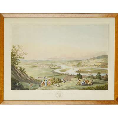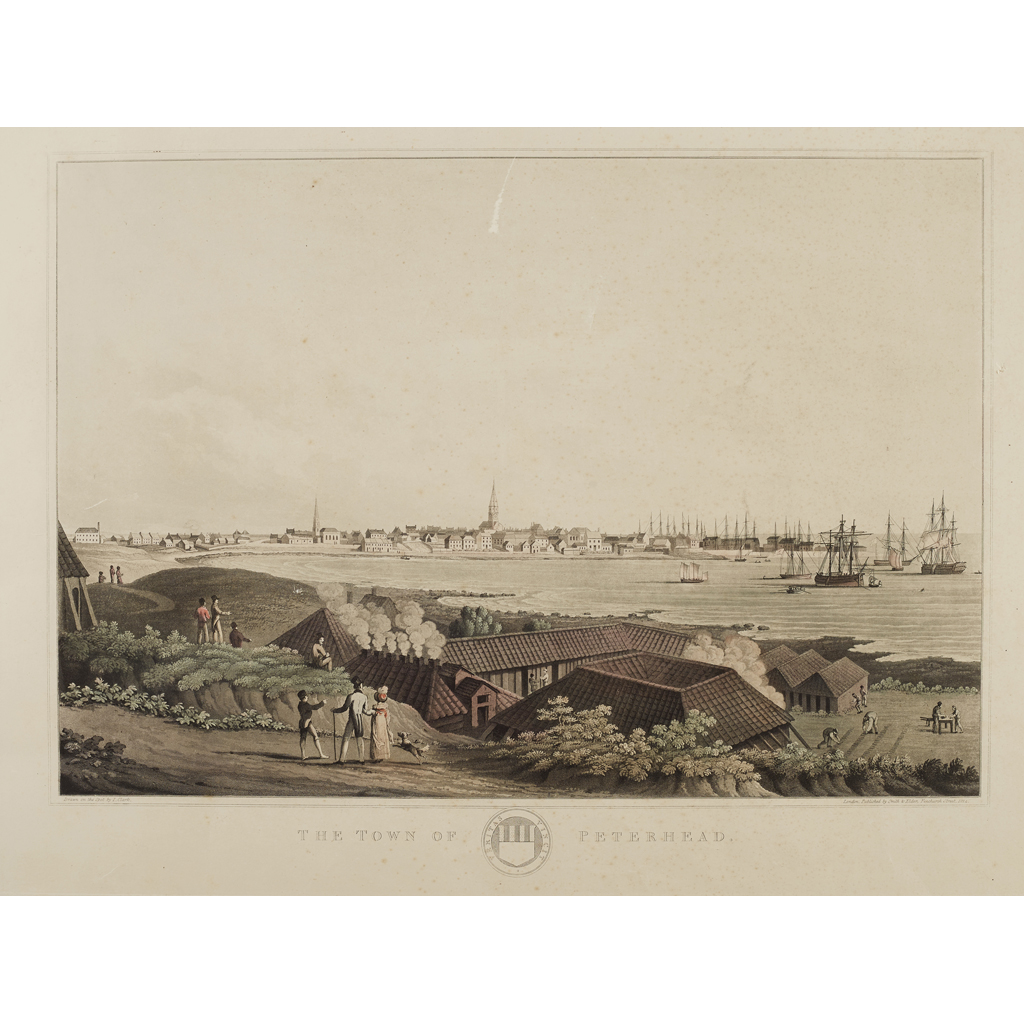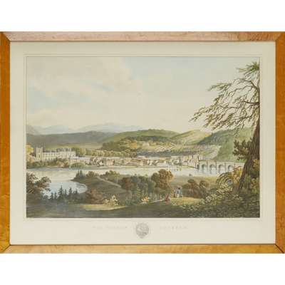 The Town of Renfrew. London, 1824, hand-coloured, c.47 x 63cm, framed and glazed, 2cm long tear and repair in upper left corner; [Idem] The Town of Perth, hand-coloured, c.47 x 63cm, framed and glazed; [Idem] The Town of Dunkeld, hand-coloured, c.47 x 63cm, framed and glazed; [Idem] The Town of Peterhead, hand-coloured, 68 x 52.5cm, unframed (4)