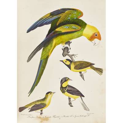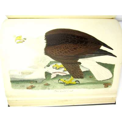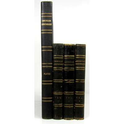 American Ornithology; or, The Natural History of The Birds of The United States. New York: Collins & Co.; Philadelphia: Harrison Hall, 1828-29. 3 volumes, 4to (235 x 138mm.), and 1 volume folio, 76 hand-coloured engraved plates, tissue guards, text dark green half morocco, spines gilt, atlas in later matching dark green quarter morocco and black cloth, text volumes slightly darkened, rubbed, fore-margin of plate volume title stained at outer edge, plate 39 & 44 with small nick from fore-margin, small stain to plate 26, otherwise plates bright, upper joint of volume 1 split and fragile