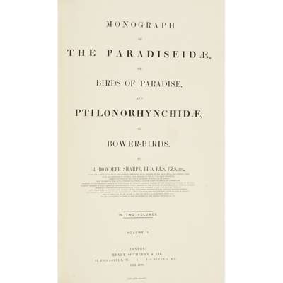 Some of the plates are printed from the stones used in the Birds of New Guinea but, as Sharpe's preface states, 'a great number of the species are here figured for the first time'. Although Elliot had published his Birds of Paradise in 1873, many species were still undiscovered, and Bowdler Sharpe's monograph, with double the number of plates, brought the tale of exploration of New Guinea up to the turn of the century, and omitted no more than two or three of the very latest finds. As such it is a much more valuable work than D.G. Elliot's. BM(NH) IV, p. 1910; Fine Bird Books p. 142; Nissen IVB 865; Whittell p. 663; Wood p. 565; Zimmer pp. 581-2 (erroneously calling for 72 text leaves in vols I and II, rather than 48 and 52 respectively). (2)