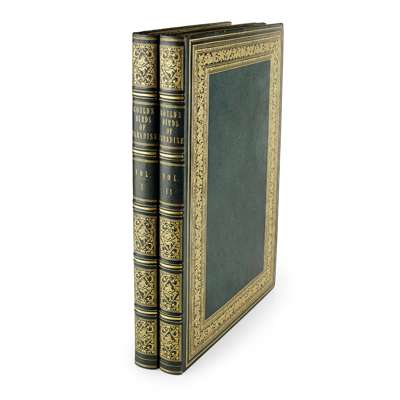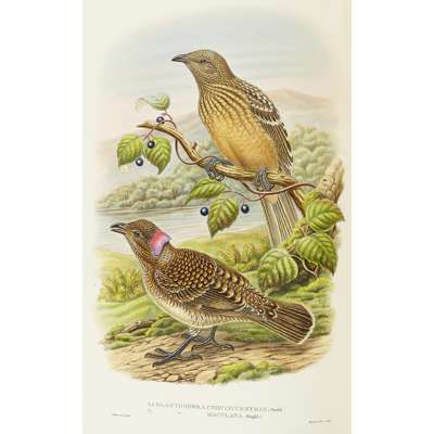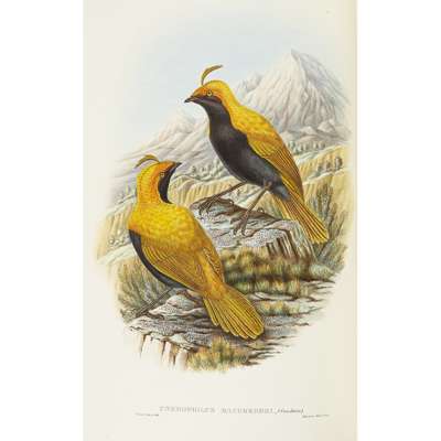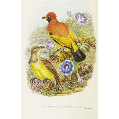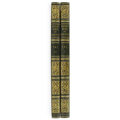 Monograph of the Paradiseidae, or Birds of Paradise, and Ptilonorhynchidae, or Bower-Birds. London: H. Sotheran, 1891-98. First edition, folio, 8 parts in 2 volumes, folio ( 540 x 358mm.), 79 hand-coloured lithographic plates heightened with gum arabic by W. Hart after Hart, J. Gould, and J.G. Keulemans, printed by Mintern Brothers, photographic and engraved illustrations, green panelled morocco gilt, spine gilt, g.e., occasional very slight spotting of the text, one or two plates very slightly spotted (2)