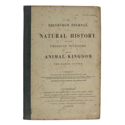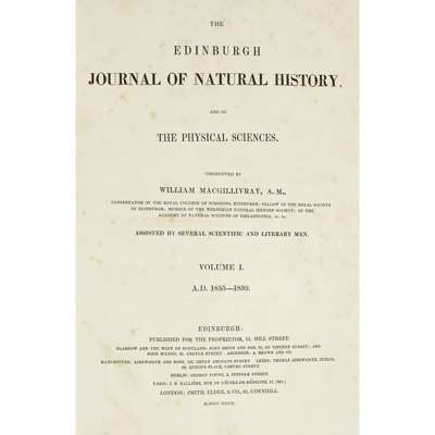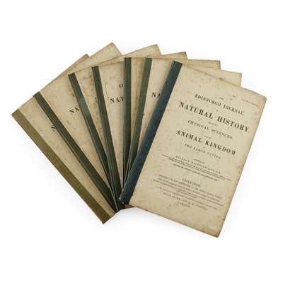 The Edinburgh Journal of Natural History, and of the Physical Sciences. Edinburgh: for the Proprietor, 1835-40. First edition, 2 volumes in 7 original parts, (all published), complete with 130 hand-coloured engraved plates (as listed in the "Index to the Illustrations of Part A [-G]" pasted onto the front endpapers of each part), tissue guards, original cloth-backed printed boards, uncut, the boards somewhat spotted