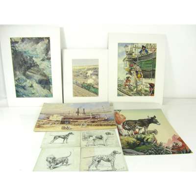 Specht, August Huskies Pulling Sleighs, 20 x 16cm, watercolour, signed; Brock, J.M. Pirates, 29 x 21cm, watercolour, for Marvellous Escapes, signed; another for Marvellous Escapes showing a boat in a storm, acrylic on board and bearing the name of Cyrus Cuneo; Wylie, Jenny 4 pen and ink illustrations, including two showing Edinburgh Castle, largest 16 x 21.5cm, initialled; 26 small ink drawings, mainly of dog breeds; and 5 others by unknown artists (37)