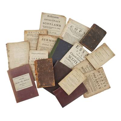 Halting Stigmatiz'd in a Sermon Preached to the Honorable House of Commons. London: C. Meredith, 1644. [8], 21, [3]p., 4to, first and last leaf blanks, disbound, slight dust-soiling, [ESTC R17704]; Bridges, Walter Ioabs Counsell, and King Davids Seasonable Hearing it. London: A. Cooke, 1643. 4to, [8], 23, 4to, soiled, disbound, some headlines trimmed, [ESTC R204247]; A True Copy of the whole printed Acts of the General Assemblies of the Church of Scotland. Printed in the Year 1682. [2], 485, [13], old calf, lacks lower board, one board detached; A Letter containing an Humble and Serious Advice to some in Scotland. [Edinburgh] printed [Tyler], 1661. 4to, 15pp. [however ESTC R222051 calling for [2], 14pp.], page 15 repaired with loss to one letter; bound with To His Grace His Majestie's high Commissioner and the High Court of Parliament, the humble Address of the Synod of Aberdeen. [Aberdeen, 1661, from final leaf], [4]p., 4to, drophead title, [ESTC R425293], a few words trimmed, cloth-backed boards; C[umming], A[lexander] A Sermon Preached upon Christmas Day. Edinburgh: A. Symson, 1705, 4to, [4], 52, [ESTC T192316], disbound, slight marginal staining; [Anonymous] The Restoration of Episcopacy in Scotland. London, Printed in the Year 1705. 4to, 8pp., disbound, one word & some page numerals trimmed; [Anonymous] The Mystery of Magistracy unvailed [sic]. Edinburgh: Heirs and Successors of Andrew ANderson, 1708. 4to, 51. [1], disbound, [ESTC T102220], 2 short sellotape strengthening; Simson, John] A True and Authentick Copy of Mr John Simsons Letters to Mr Robert Rowen. [Edinburgh: printed by John Moncur, 1716]. 4to, drop-head title, [ESTC T176500], disbound; Campbell, Daniel Man's Chief End and Rule. Edinburgh: J. Moncur, 1719. 2 parts in one vol., 8vo, contemporary calf, [ESTC T172630]; Gibbon, Thomas The Religious Observance of the Sabbath. London, 1749. 8vo, disbound; Haldan, Bernard The Foundations of Religion and Morality. A Sermon Preached in the Tron Church of Edinburgh. Edinburgh: Hamilton &c., 1756. 8vo, [4], 31, [1], disbound; Fordyce, James The Delusive and Persecuting Spirit of Popery. Glasgow, 1758. 8vo, disbound; Dow, John The Trial of the Rev. Niel Douglas... for Sedition. Edinburgh, 1817. 8vo, frontispiece portrait, cloth; A Second edition of the Debate in the Shop about Imparity among Pastors. [Edinburgh ?, 1703]. 4to, 15, [1], disbound, [ESTC T95635]; [Cromaty, George Mackenzie, Earl of] A Few Brief and Modest Reflexions perswading a Just Indulgence to be Granted to the Episcopal Clergy and People in Scotland. [Edinburgh], 1703, 4to, 7, [1]p., disbound, [ESTC T79929]; Cullen, Francis Grant, Lord AN Essay for Pace, by Union in Judgement; about Church-Government in Scotland. Edinburgh: Heirs of Andrew Anderson, 1703. 4to, 21, [1]p., disbound, imprint cropped, [ESTC T79907]; [Church of Scotland] The Protestation of the Generall Assembly of the Kirke of Scotland. Edinburgh: J. Bryson, 1639. 4to, cloth; Willison, John A Letter from a Parochial Bishop to a Prelatical Gentleman in Scotland. Edinburgh, 1714. 8vo, [6], 146, quarter morocco, last 2 pages in pen facsimile
