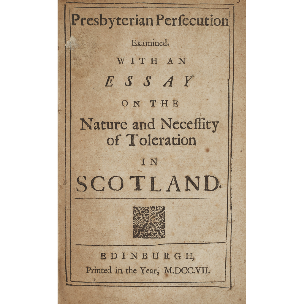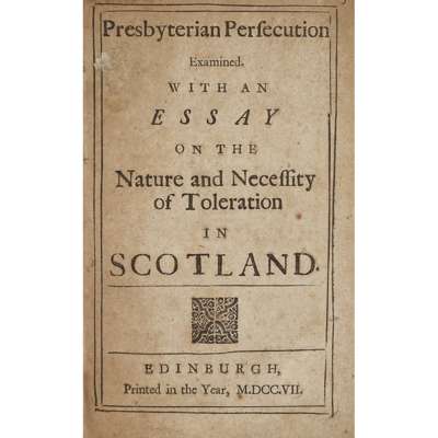 Presbyterian Persecution Examined. With an Essay on the Nature and Necessity of Toleration in Scotland. Edinburgh: printed in the year MDCCVII [1707]. 8vo, 40pp., disbound, title and final leaf somewhat browned, [ESTC T66285; 12 copies in U.K., 6 in U.S.A.]