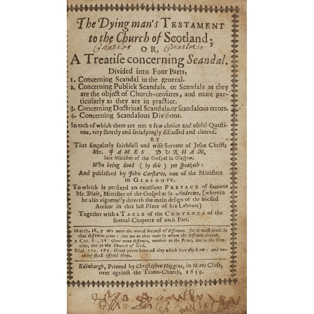 The Dying Man's Testament to the Church of Scotland or a Treatise concerning Scandal. Edinburgh: Christopher Higgins, 1659. 8vo, [32], 432, contemporary calf, rebacked, [ESTC R3845]