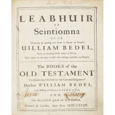 Leabhuir na Seintiomna. London: 1685. 4to, contemporary calf, bookplate, early ownership signatures to title-page; joints split, covers and spine rubbed, a few small holes and a little marginal worming throughout, slightly affecting text and page numbers, final leaves a little dampstained and chewed [ESTC R23375]