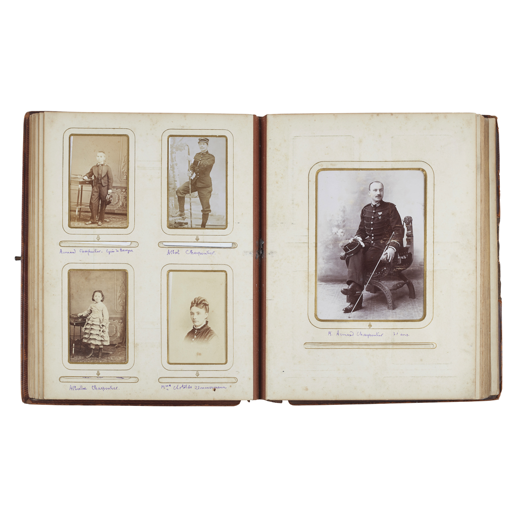 A collection of 7 French carte-de-visite albums, including one relating to the Charpentier family of Brest, with 16 cabinet cards and many cartes-de-visite by Otto Mertens, M. Berthaud, A. Boname, Giraud and others, c.1870s-90s; a small album relating to the Desouches family, containing 27 cartes-de-visite; a small album of 34 cartes-de-visite, many taken by Horde; a small album of 22 photographs, including several featuring women carefully posed outdoors, and a couple feeding pigeons; an album containing 63 cartes-de-visite by A. Crolard, Jally, Paul Berthier, Piroum Madame de Hermann and others, including Captain Massé of Madagascar and Borelli of Constantinople; and 2 others; [ALSO] a small British album containing 37 carte-de-visite photographs by Pflaum & Co., Mayall, W.W. Hughes and Edmonds, Maull & Fox, and others, including General Colley, Charles Hallé, Bismarck and Thomas Carlyle (8)