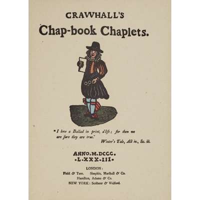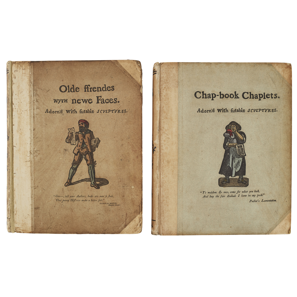 Crawhall's Chap-book of Chaplets. London: Field & Tuer., 1883. 4to, hand-coloured woodcuts throughout, original boards, a little soiling to boards, upper joint slightly split, one leaf neatly repaired; [Idem] Olde Ffrendes wyth newe Faces. London: Field & Tuer., 1883. 4to, hand-coloured woodcuts throughout, original boards with some wear and soiling (2)